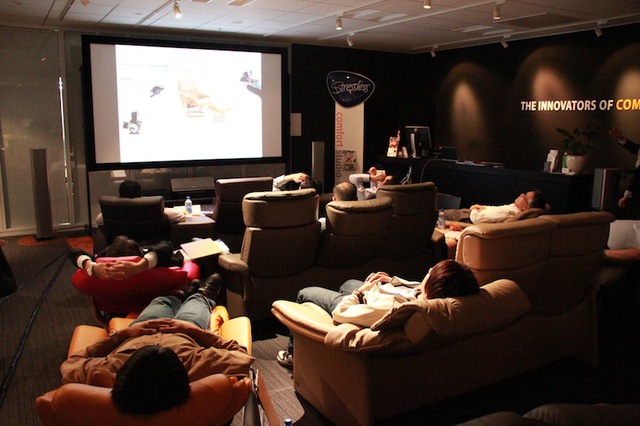リクライニングを全開にして4K映像を楽しむイベント参加者。途中で視聴位置の交代も行い、全員が1.5Hでの4K映像が体感できるように配慮されていた