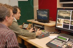 ビデオカメラの操作卓は写真でもわかる通り実にコンパクトで、しかもカメラ6台分の操作を一人で行うという。オペレーターが一人だけというのは予想外だったが、装置を見れば納得がいく。右側のボタンでカメラを選び、ジョイスティックでズーミングとパンニングを行う操作は、慣れればたしかに一人でこなせそうだ。中央の小さなボタンには特定のカメラポジションを記憶できるため、オーケストラの場合はコンサートマスター、ビオラ、フルートといった具合に大体の位置を記憶させておくことにより、カメラが目的の位置を狙ってほぼ一瞬で動く。記憶させるカメラ位置はオーケストラの編成に合わせて自在に変更できるようになっており、大体の位置はリハーサル時に決めておくのだという。