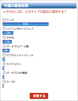 Blu-ray 3Dタイトルの発売もいよいよ始まった今年の秋、3Dに関連したもう一つの動きとして「メガネなし」の裸眼3Dに関するニュースもちらほらと報じられるようになってきた。今回の読者投票では、いまPhile-web読者の方々が期待する裸眼3D技術搭載製品について、関心の度合いを募ってみた。