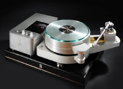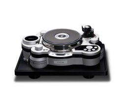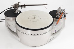 物理化学博士でもあるクリスティアン・ファイキャルト氏が創設した独ハイエンド・ブランドのフラグシッププレーヤー。2本のロングアームが搭載可能で、特に右側のアームベースには通常の民生用では用いられない13インチのアームも搭載できる。キャビネットは、60mm厚の芯材の上下を、8mm厚のアルミニウム製ボードで挟んだ構成で、高い剛性を実現。3モーターを採用し、重量のあるプラッターを安定して、かつムラなく駆動することができる。