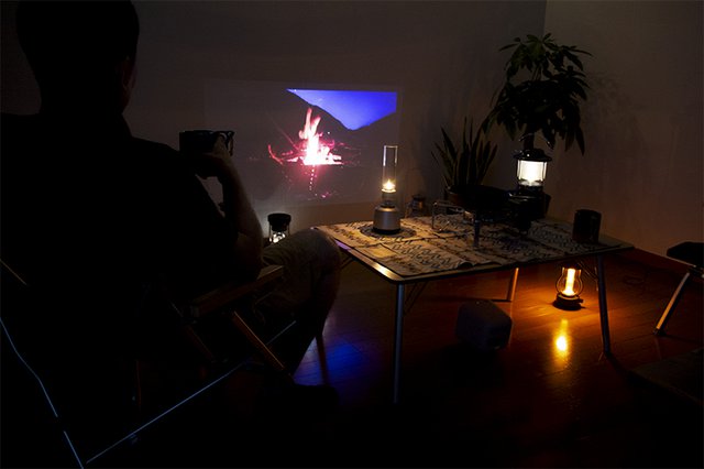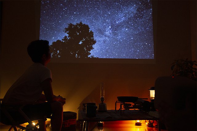 ぼんやり火を眺めていたら、日が高い夏とはいえ、あっという間に外は真っ暗だ。最後はやっぱり、都会ではなかなか見られない満点の星空を見たい。プラネタリウムがあればその方がより良いかもしれないが、今回はプロジェクターで夜空の煌めきをカバーすることに。高い位置に映し出したかったので、ミニ三脚をつかって底上げしてみた。