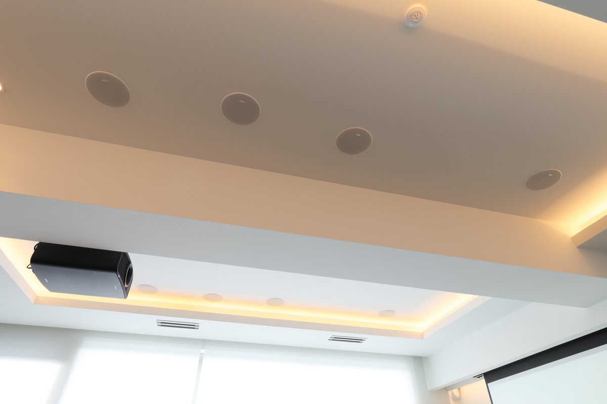 埋め込みスピーカーの設置に匠の技が光る。天井の中心に既存の梁があり、この梁をはじめ、天井形状による影響を可能な限り受けないように最適化されている。特に右側スピーカーは、梁による音の反射や遮りの影響を回避するよう、数cm単位で調整しており、厳密に音響バランスを整えているのだ。