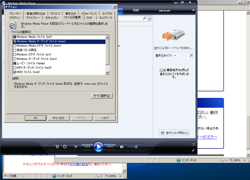 WMP 11の場合は「書き込み/その他のオプション」から「ファイルの種類」を選択するとwmaファイルが再生できるようになる