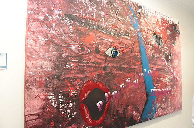 社員によるアート。HD 800のボイスコイルなどをあしらっているのがポイント。かなり前衛的