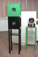 本機では、2チャンネルステレオがもつ指向性(直接音)を、本体の球体前後に2基搭載された10cmフルレンジユニットが受け持ち、加えて多孔質セラミックス球体エンクロージャーを構成する無数の気孔から背面音を放射させることで、バンドパスフィルター効果に近似した音響特性が獲得されている。ブースで行われるリスニングタイムの際に本機のサウンドを味わうことができる。スピーカー「New GB25」のカラーバリエーションモデルも紹介され、注目を浴びていた。