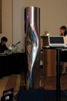 筐体のデザインは、世界的に著名なインダストリアルデザイナー、ロス・ラブグローブ氏が担当。筐体は全面が特殊なスーパーフォームド・アルミニウムで作られている。アルミニウムの厚さは6mm。熱したアルミニウムの板をモールドの型に置き、瞬間的に真空成形させる工法により、複雑な曲面を実現させている。ラブグローブ氏は、「筐体は周りの景色などを反射する。どんな環境でも周りの風景に溶け込むデザイン」とアピール。製品の価格についても、「私が作ったオブジェは、小さなものでも30万ドル程度するものがあり、それでも購入される方がいる。それと比べてみて欲しい」と述べ、同氏のデザインが施されたMUONの価格は、決して高くないと主張した。