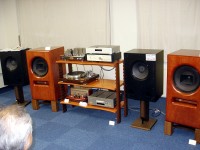 3Fの展示会場で販売ブースも含めて展開してた同社のブースでは、大型真空管845を用いたオーディオスペースのフラグシップモデル「Reference One」をハーフサイズにし、出力管を805に置き換えた「Reference Three 805」(¥735,000/ペア)を中心にしたラインナップを揃えていた。リスニング・システムには誕生60周年を迎える、英国の名門“ロジャース”のA級管球アンプ「E40a」(出力管6L6GT×8、出力40W)とその小型版「E20a」(同6L6GT×4、出力20W)も用意され、今回の復刻に当たってBBCから再度ライセンスを取得した「LS3/5a」もセットされていた。