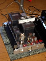 同じ5Fのフロアーの別室では、サンスイトランスの製造元として知られる橋本電気と、橋本電気が手がけるハシモトトランスを製品に用いているアストロ電子企画がデモを行っていた。アストロ電子企画の製品は、重厚な構成によるシャーシによって形作られており、「AS-KT88MK II」の内部構成を見ても分かるように、全面銅板による本格的な仕様で、きれいに手配線されたハードワイアーが美しい工芸品のようである。試聴システムに用意された上位ラインナップVIPシリーズの音質は、優雅で落ち着きのあるものであった。