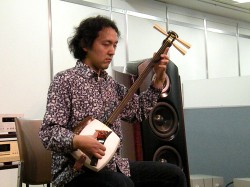 有楽町の東京交通会館で開催されているハイエンドショウトウキョウ2009スプリング。最終日を迎えた24日の音元出版ブースでのイベントは、小林貢氏を講師に迎えての「話題のCD聴き比べ」からスタートする予定だったが、うれしいハプニングが起こる。イベント開始前に急遽、津軽三味線の生演奏が披露されたのだ。