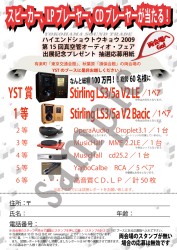 (有)ワイエスティーは、今週末に東京で開催される「ハイエンドショウトウキョウ2009」(10月9日〜11日)と「第15回真空管オーディオフェア」(11日〜12日)にて、同社の取り扱い製品が当たるプレゼントキャンペーンを実施する。