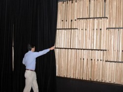 試聴室は壁面がAGSで覆われており、カーテンでAGSを遮ることも可能。カーテンを開閉することで、製品の有無によってどれほど音に違いが出るのかを実感できるように作られている。