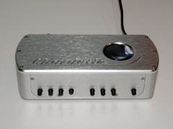 ドイツのAcoustic Planは、真空管プリアンプを内蔵したユニークなミュージックサーバー「Mudra」を発表。スケルトン仕様で確認すると、手前に500GBのHDDを2基搭載し、そこから一番離れた位置に真空管を用いたアナログアンプ回路が設けられていることがわかる。内蔵するディスクドライブはCDとDVDに対応したティアック製で、D/Aコンバーターは192kHz/24bitに対応している。最先端のデジタルオーディオエンジンと真空管アンプの組み合わせは奇抜に感じるかもしれないが、再生音はワイドレンジでスピード感もあり、きわめて高い水準を実現していた。なお、HDDはSSDに変更することも可能だという。操作は専用のタブレット型端末で行う。