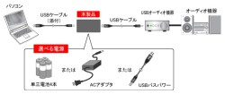 本機は、PCとUSBオーディオ機器のあいだに接続し、USBバスパワーしか使用できないUSBオーディオ機器に、USBの電源ラインから外部電源を供給する機器。