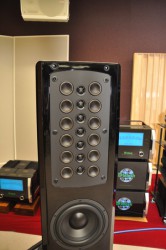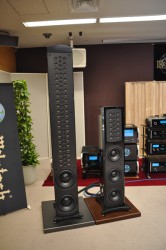 スピーカーは大柄な「XRT1K」の展示がひときわ目を引いた。本機は4年前から既に発売しているモデルだが、日本国内では今回初めて披露されたこともあり、来場者の関心を集めていた。スピーカーの形式は「バスレフ型3ウェイ74スピーカー」。筐体の最上部にバスレフポートを設けたトップポート方式を採用している。平面バッフルボードに28個のトゥイーターと44個のミッドレンジをインライン対称配置し、水平方向に広い指向特性を持たせている。バイアンプ接続、およびトライワイヤリング接続にも対応する。国内では受注生産により、525万円(ペア/税込)で展開される。