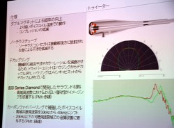 カーボンブレース・トゥイーターにより、これまでのアルミドームトゥイーターでは30kHzだった高域共振周波数が40kHzまで向上した。ダイヤモンドドームの場合、これが70kHz程度になり、さらにハイスペックになるが、B&Wの技術者は今回の新技術について「コウモリにしか聞こえないような可聴帯域外のためのものではなく、聞こえる周波数の音を良くするための技術だ」と説明しているのだという。