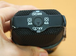 録音時は、ダイヤル式のスイッチで2つのマイクパターンを選択することが可能。音声は2chステレオモードと4chサラウンドモードの録音に対応している。MSマイクとXYマイクを同時使用することで、4chのサラウンドレコーディングが行える。また、録音時はRECボタンを指一本で軽く押して、机に立てて使えるよう工夫している。