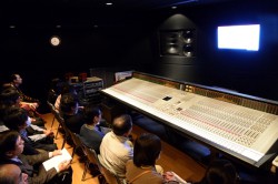 その後、ラージモニターが設置された202スタジオに入り、ハイレゾ音源の試聴が行われた。まずは、圧縮音源とCD同等レート、そして96kHz/24bitのハイレゾ音源の比較試聴や、CDマスターからハイレゾ化する独自技術「K2HDプロセッシング」による、ハイレゾ化の効果試聴が行われた。