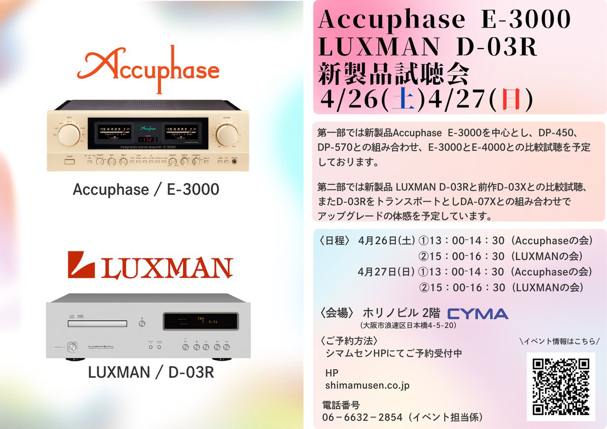 シマムセン、アキュフェーズ「E-3000」&ラックスマン「D-03R」試聴会を4/26-27に開催