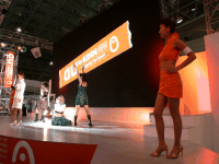 | <左>オレンジ色のauブースはいやでも目を引く <右>ステージでのパフォーマンスもひときわハイレベル |