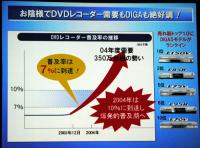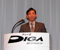 続いて同社パナソニックマーケティング本部商品企画グループ参事の石原史康氏が登壇し、レコーダーとメディア新製品の詳細を説明した。石原氏は「これからは標準画質はビデオデッキからDVDレコーダー、ハイビジョン画質はD-VHSデッキからBlu-rayディスクレコーダーへと需要が切り替わるであろう。」と同社の予測を示した。Blu-rayディスクの新製品については、ハイビジョン放送を余裕をもって録画できる最大36Mbpsの高速転送レートを実現し、またコピーワンスコンテンツの録画にも対応する高信頼性を実現したと、その特徴が石原氏より語られた。