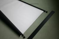 スクリーンは表示面から周囲のフレームまですべて紙なので軽量なのが最大の特徴。80インチワイドものでもわずか1.4kgしかない。ということで取り付けも楽だし、持ち運びにも便利とこれまでのスクリーンではできなかったことがクリアされた。ただし、表示面も紙なので1つ懸念されるのが平面性だ。カールしないか、シワが出ないかなど、開発もその点が苦労だったそうだ。製品化では両サイドに上下を突っ張るように固定フレームを設けるようにしてある程度解決させた(完全にシワがなくなったわけではないが)。