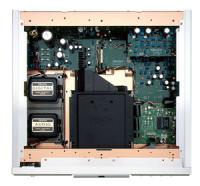 電源はデジタル系とアナログ系の2トランス構成とし、相互におよぼす干渉を排除。漏洩磁束を互いにキャンセルする方向に配置したり、シャーシへの取付ベースには振動減衰特性に優れたアルミ鋳物を採用するなど、様々な工夫を施している。