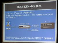 AVファンの興味は、現行DDとDD+の互換性であろう。現行DDデコーダーはDDビットストリームのみデコード可能。DD+デコーダーは現行DD、DD+どちらのビットストリームもデコード可能。つまり「上位互換」である。しかしながらDD+には、DDコンバーターという機能がある。DD+の信号が次世代デコーダーに入ると、SPDIF(いわゆるデジタル音声出力)から現行DDを出力可能になっているので、現行AVアンプでも5.1ch再生がサポート可能となる。ただし、セットトップボックス+チューナーはそのとおりだが、次世代ディスクプレーヤーではオーディオ・ミキシング機能とのトレードオフで、DDコンバーターが付かない場合もある。