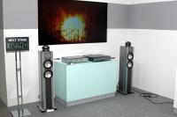 同社独自の“1bitアンプ”を搭載した製品も多数展示。BDレコーダー「BD-HD100」、DLPプロジェクター「XV-Z2000」と組み合わせて展示されているのはプリメインアンプ「SM-SX10」。スピーカーは同系色のELAC社製「FS608X-JET」を接続し、近未来的なシステムを構築している。