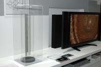 薄さを追求するディスプレイにあわせてスピーカーも薄型化を、という考えの基に開発された「1ビットアンプ高効率コンデンサースピーカー」も展示を行う。静電気を利用して振動板を駆動する方式を利用した同スピーカーの音は、実際に体験することが可能だ。