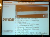 今回最も注目を浴びたのは、初公開となるHD DVDプレーヤーだ。本プレスカンファレンスでは「HD-XA1」「HD-A1」と名付けられた2モデルが発表された。両機ともHD DVD/DVD/CDに対応した再生専用機で、HD DVDソフトの発売にあわせ3月頃に発売する予定だ。「HD-XA1」は外観などに高級感を持たせた上位機。価格は「HD-XA1」が799.99ドル、「HD-A1」が499.99ドル。また、ノートパソコン“Qosmio”のHD DVDドライブ搭載モデルも今年発売すると発表した。