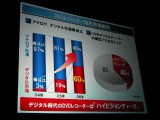 続いてDVDレコーダーの国内市場動向が紹介された。同社の調査データによれば、2006年にはDVDレコーダーのアナログ・デジタル構成比が「デジタル機60%」となり、2005年デジタルチューナー内蔵型での同社シェアは40%だという。牛丸氏は「これからのデジタル時代に主力となるDVDレコーダーはハイビジョンディーガだ」とし、これからますます需要が高まる「デジタルエンターテインメントの大画面化・高画質化」へのニーズに、同社の薄型テレビ「VIERA」、デジタルレコーダー「DIGA」の強力なラインナップで応えて行きたいと意気込みを語った。