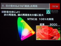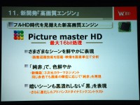映像回路部には、従来の画像処理エンジン「Picture master」を改良し、デジタル放送のデコーダーLSIと統合することで処理能力を向上した「Picture master HD」を搭載。複数の指定色を他の色に影響を与えることなく同時にコントロールし、それぞれ独立した色合い、色の濃さ明るさを調節する「3次元デジタルカラーマネージメント」をはじめ、シーンに応じた最適なコントラストと階調を表現する「アドバンスドダイナミックコントラスト」、SD信号の画像の動く方向を検出して高画質なプログレッシブ処理を行う「動きベクトルIP変換処理」などの技術を可能にした。