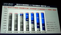 藤井氏は冒頭、地上デジタル放送の普及動向について説明。2006年末までに82%、2008年までに99%の世帯で地上デジタルの視聴が可能になることを確認した。藤井氏は、地上デジタルへ完全に移行する2011年に向け、HD DVDレコーダーやプレーヤーの需要が急速に増加すると予測。DVDプレーヤー・レコーダーのうち、HD DVD対応モデルが、2008年度には45%、2011年には95%に伸長するとの見込みを示した。