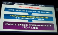 藤井氏は続けて、「今回、当社ではRD-A1を『HD DVD搭載ハードディスクレコーダー』と位置づけている。多くの方は『HD DVDレコーダー』と名付けると考えていたと思うが、あえて本質をついたネーミングにした。実際のHDD+DVDレコーダーの使われ方でも、99%の方はまず初めにHDDに録画している。レコーダーの本質はHDDだ」と、本機の位置づけを説明した。