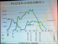 同氏は、2003年の地上デジタルテレビ放送開始後薄型テレビ市場が大きく拡大しており、2010年には1,300万台超のマーケットになるだろうと指摘。また、ネット接続もアナログ電話回線から、イーサネットやTCP/IPを標準実装した双方向規格のブロードバンド環境が普及してきているとし、「2001年のBSデジタル放送の開始から、ネットテレビの時代が始まっている」と説明した。