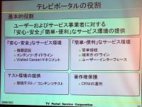 大野氏は、同社の果たすべき役割を「ユーザーおよびサービス事業者に対する『安心・安全』『簡単・便利』なサービス環境の提供」であると定義し、テレビポータルサービスの必要性を3つ挙げた。