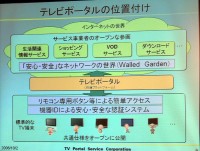 ひとつは、テレビならではの「安心・安全」「簡単・便利」なサービス環境を実現することだ。以前から家庭の中心にあったテレビはユーザーの信頼感が厚い。パソコンのように、ユーザー側にリテラシーを求めるものではなく、飽くまで家電としての使いやすさを追求し、そこにネットワーク機能を付け加える。また、安全なネットワークの世界として「Walled Garden」という概念を導入。これは同社によって吟味された安全な情報を提供するものだ。同氏は「ネットはよく広い海に例えられるが、『Walled Garden』はよく整備されたプライベートビーチと言える」と語った。