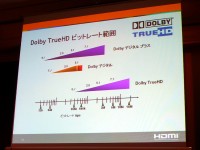 ドルビーTrueHDは、可逆圧縮(ロスレス)のオーディオフォーマット。非圧縮音声の1/2〜1/4のデータ量を実現しており、同氏は「映画コンテンツなどでは映像の品質に影響を与えることなくディスクに収録できるのが強みである」と説明した。また、技術的には14chをサポートしており、将来的な拡張も視野に入れているという。