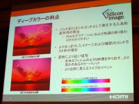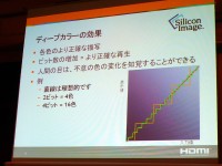 本説明会ではディープカラーについて詳細な説明が行われた。ディープカラーは、RGB各色の信号処理を10ビット/12ビット/16ビットで行うことで、従来の8ビットの色数を超える色調表現が可能な技術。今回のHDMI1.3では、このディープカラーの伝送に対応し、カラーバンディングのない「より自然界に近い色」を再現できるとした。クオ氏は「バンディングをなくすには12ビットが必要。また、現状のHDコンテンツは製作段階の映像処理時に劣化が起こっており、元のクオリティを維持するには16ビットが必要だと考えている」と、16ビットまで対応した理由を説明した。会場では8ビットと10ビットの映像の差をデモ。10ビット時のグラデーションの表示能力を説明したほか、暗部での表示能力の高さを強調した。また同氏は、シリコン・イメージング社がディープカラー対応のチップをすでに提供開始していると紹介した。