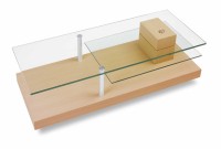 組み立て式のホームシアターラック。アシンメトリーでスタイリッシュなデザインを採用している。ソファーからの視線にこだわった「低視線設計」を施しており、高さを40cm以下に抑えている。天板には15mm、中板には10mmの強化ガラス(英国BS6206A規格に準拠)を使用している。