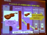 実際の製品については、オンキヨー(株)商品企画部部長の神谷速夫氏が説明した。詳細は別項の製品ニュースに譲るが、神谷氏は、商品開発の背景について、「デジタルオーディオプレーヤーが600万台市場になり、PCを介したリスニングスタイルが定着した。このような状況の中、オーディオ技術の推進と継承を図っていくのが我々の責務と考えた。ただし、PCを否定しても始まらない。PCアーキテクチャーを活用しながら、原音再生を行うことを目指して開発に着手した」と説明した。