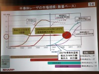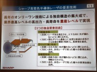 発表会にて大塚氏は、同社半導体レーザー事業について紹介した。同社はこれまで、CD用赤外、DVD用赤色、次世代用青紫色の3波長のレーザーの開発において業界をリードしてきたという。現在同社は3波長のレーザー素子や全て量産しており、「シャープは、レーザー、ピックアップ、商品と、川上から川下までを垂直統合するのを得意としている」と同氏は語った。