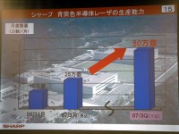 半導体レーザーの市場規模については、「DVDのときのように、商品立ち上がりから5年で1億個(グローバル)となる予測をしている。2007年度は低出力タイプで1650万個、今回のような高出力タイプで80万個の需要を見込んでいる」と説明。生産能力に関しては、2007年度第3四半期までに月産50万台の能力にもっていきたい」と語った。