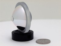 軸対称自由曲面レンズはプラスチック製。直径は約6cmでコマのような形状を持つ。