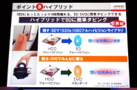 HDDに記録した映像を、BDやDVDにダビングすることも可能。BDの場合はファイルコピーとなり、MPEG4 AVC/H.264の映像をそのままコピーする。なお、DZ-BD7Hに搭載されたBDドライブの書き込み速度は2倍速。このため、HDDに撮り貯めたハイビジョン映像を、BDディスクに2倍速でダビングすることができる。DVDへのダビングの場合、もとのMPEG 4 AVC/H.264からMPEG2に変換してダビングする。