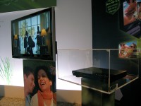 日本ビクターブースのほかの展示も見ていこう。多くが昨年展示の内容を引き継いでおり、新製品もハイビジョン Everio等、日本国内既発売のものである。そんななか、アクリルケースに大事に収納された BDプレーヤーを目にすることができる。もちろん「動いている!」のだ。ひじょうに薄型でありながら、廉価なデジタル AV機器にありがちな軽さはなく、フルコンポサイズの幅を持ったブラック仕様の外観は美しくバランスがよい。同社のフル HD-IDAプロジェクションテレビ(こちらも薄い!)に、H.264のデコード映像を映し出していた。