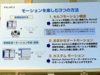 もう一つは、同梱するPC用ソフト「Motion Editor」を使用する方法で、同ソフトに楽曲を取り込むと、曲のトーンムードを解析する12音解析と、ビート解析の2つの解析が行われる。「おまかせオートモーション」機能では、この楽曲解析技術を用い、セルフモーションに比べ、よりハイパフォーマンスなモーションを、自動で設定してくれる。動きはプレビュー画面で確かめることができ、気に入らなければ何度でも異なるモーションを生成させることができる。さらに「カスタム モーション」機能では、各種の動きやライトの明滅などを、すべて自由に設定することが可能。できあがったモーションは、USBケーブルでRollyに転送することで、Rollyを楽曲に合わせて踊らせることができる。