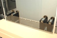 ブースの一角には同社フラットパネルスピーカーのフラグシップモデル「SP-XA160」(特集記事)などに搭載されている「超磁歪エキサイタ」の試作品も並べられている。今回は「重いものも高速で動かせる」という、新しい超磁歪材料のデモを行っている。デモでは大型の超磁歪エキサイタ「EX4298X001」を4本使い、ガラス板をパネルスピーカーとしてドライブし音を再生している。新型のエキサイタについては、スピーカー「SP-XA160」と基本構造は同じだが、素子のサイズを大型化しパワーを獲得させているものであるという。