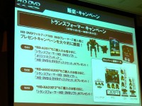 さらに所氏は、11月1日から2008年1月31日にかけて、「トランスフォーマー キャンペーン」を行うことも紹介。RD-A301の購入者には「トランスフォーマーHD DVDソフト」、「オリジナルフィギュア」、「HD DVD&DVDディスクセット」がプレゼントされる。また、RD-A600/A300購入者には「トランスフォーマーHD DVDソフト」と「HD DVD&DVDディスクセット」が、HD-XA2/XF2購入者には「トランスフォーマーHD DVDソフト」がプレゼントされる。