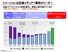 イメーションという会社は、96年にスリーエムからスピンオフし、その後、データストレージをコアに選択と集中を進め、成長して参りました。97年から05年の年平均成長率(CAGR)が6.2%。特に、01年からはLTO等の新しい商品が揃い、フェイズ3と位置付ける01年から05年では9.5%にもなっています。しかし、データストレージの成長だけではなかなか株主の期待に応えきれない。そこで、06年にメモレックスを買収し、BtoC事業にさらに積極的に取り組んでいく方針を打ち出しました。07年にはTDK Life on Recordブランドの使用ライセンス権を取得し、マルチブランドでブランドマネージメントとプロダクトマネージメントができる会社にトランスフォームしていくことを明確化しました。それは、06年からのフェイズ4において、大きな成長をBtoCのマーケットで行っていくという覚悟の表れでもあります。